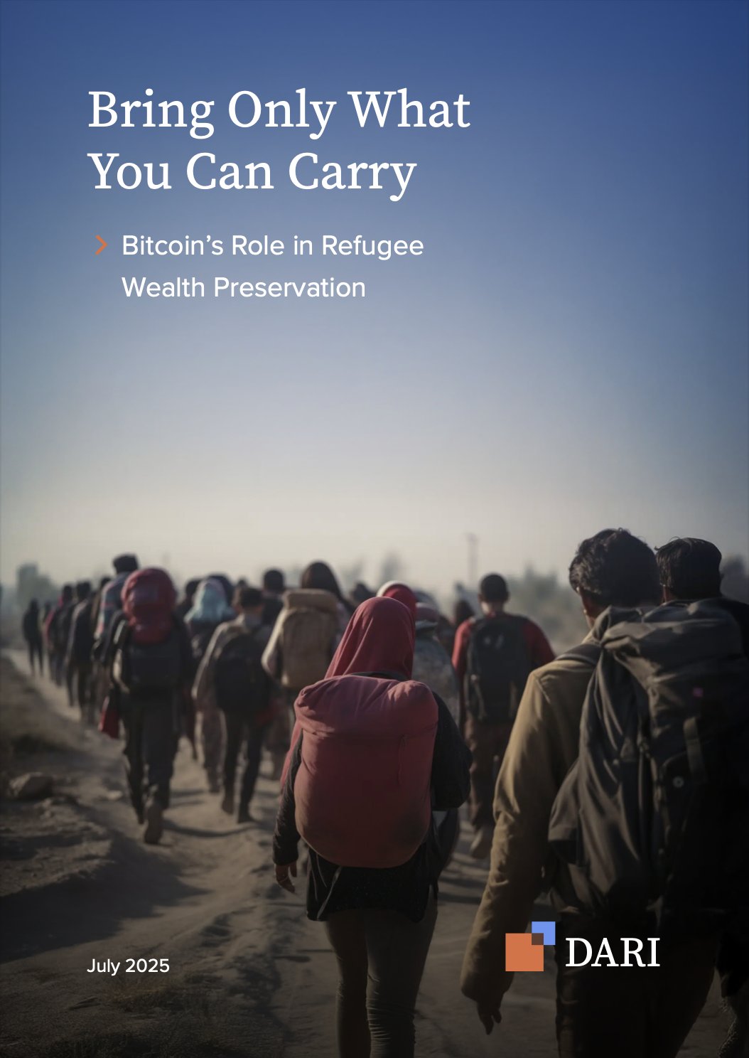 Denne banebrytende rapporten fra Digital Assets Research Institute (DARI) gir det første kvantitative anslaget på hvordan flyktninger bruker Bitcoin for å bevare og transportere formue under kriser. Den finner at minst 329 000 fordrevne personer har brukt Bitcoin for økonomisk kontinuitet, et tall som anslås å kunne vokse til opptil 7,5 millioner innen 2035.