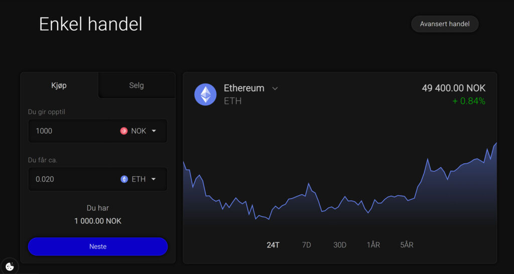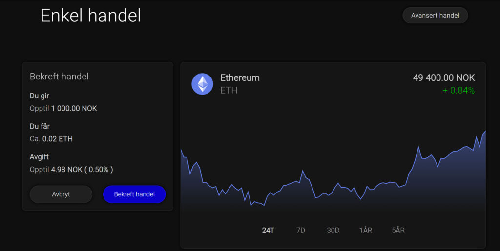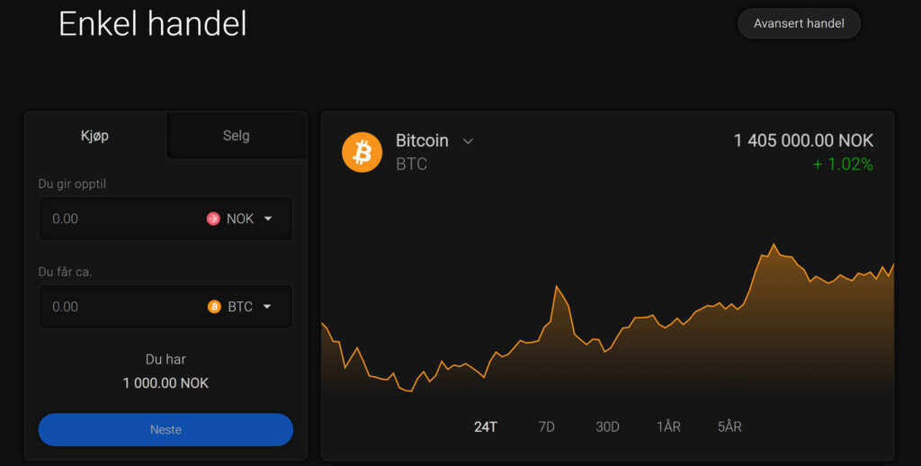 Etter at du har logget inn, klikker du på “Min konto” -> “Enkel handel” for å handle kryptovaluta.