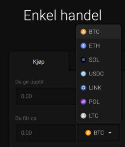 Trykk på knappen hvor det står skrevet BTC (under “Du får ca”), så vil du få opp en liste over tilgjengelige alternativer.
