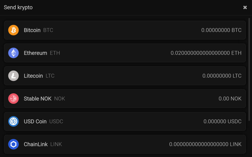 Trykk på “Send krypto”, så fremkommer disse alternativene: