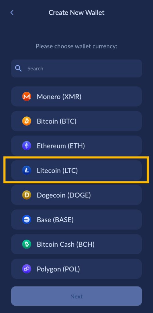 Velg som vist Litecoin (LTC)