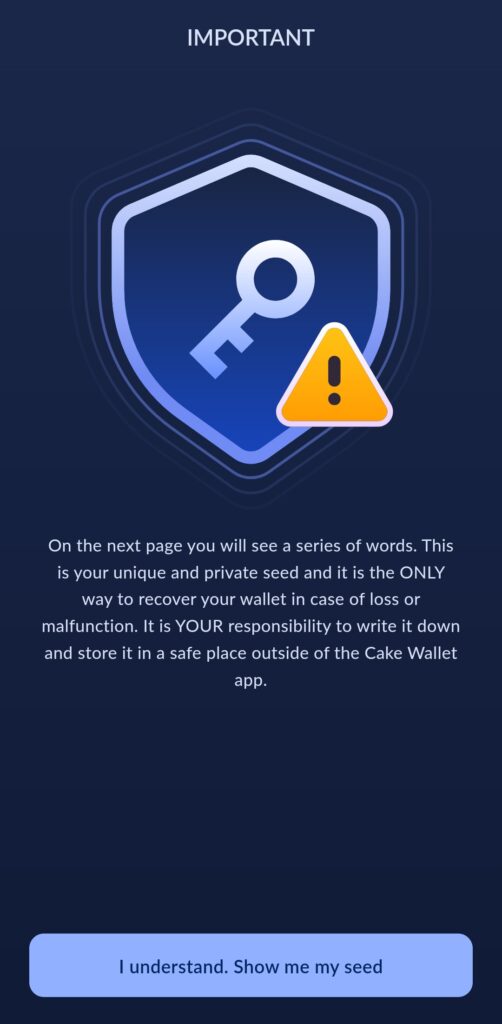 Trykk på I understand. Show me the seed