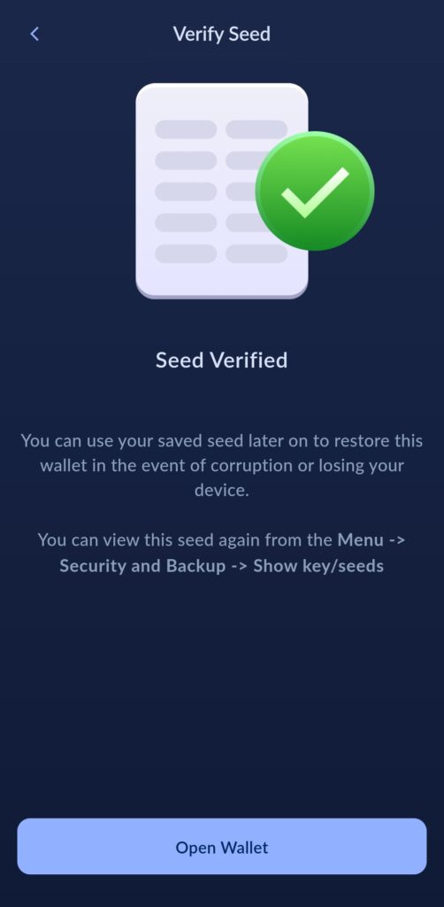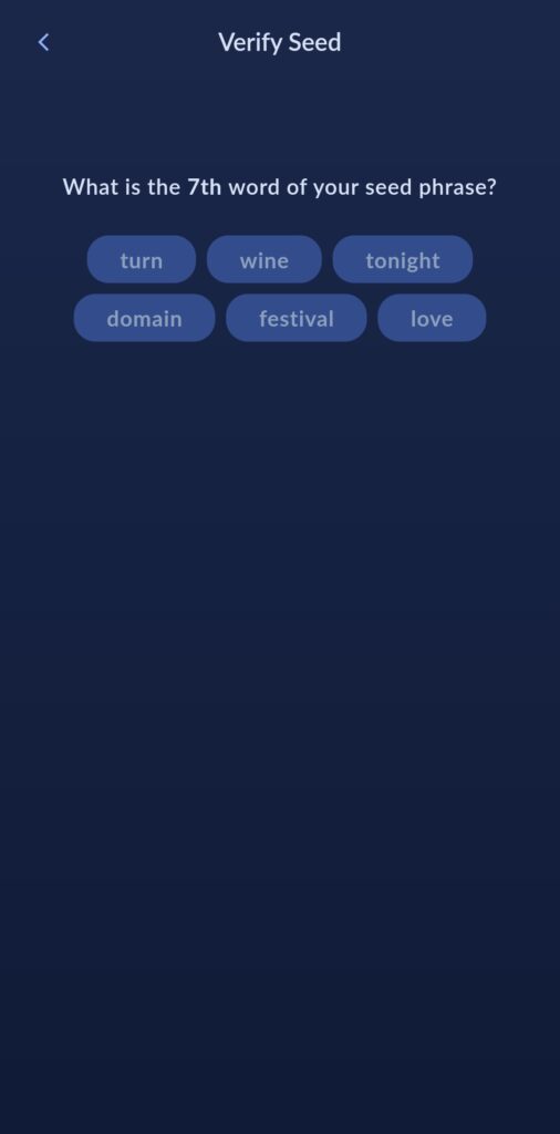Notér ned seed’en. I neste skjermbilde vil du få et par kontrollspørsmål, som bekrefter at du har skrevet den ned.