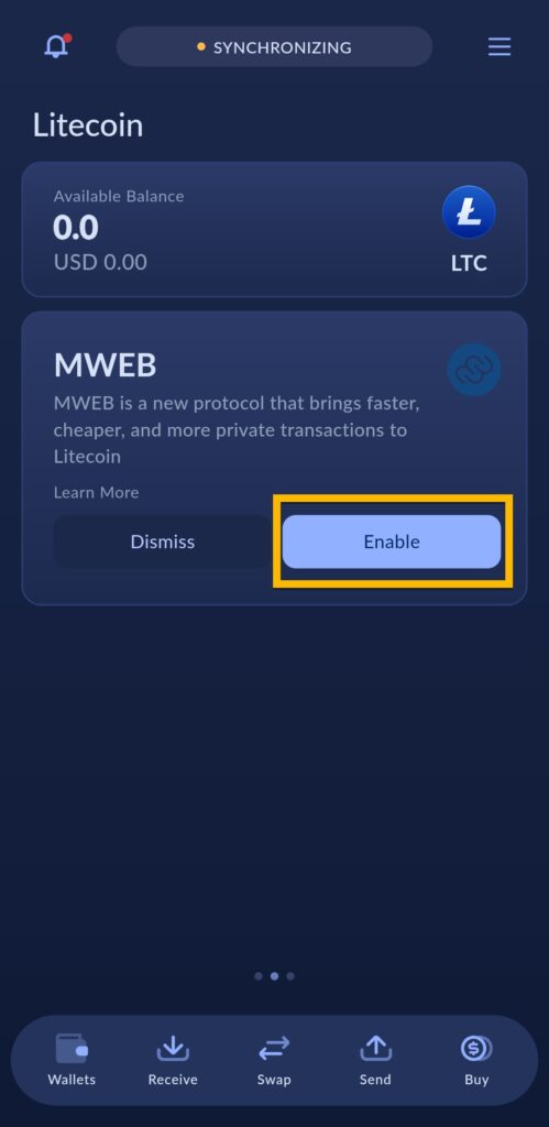 For å aktivere MimbleWimble delen av lommeboken (fra nå av kun omtalt som MWEB), må du trykke på Enable.