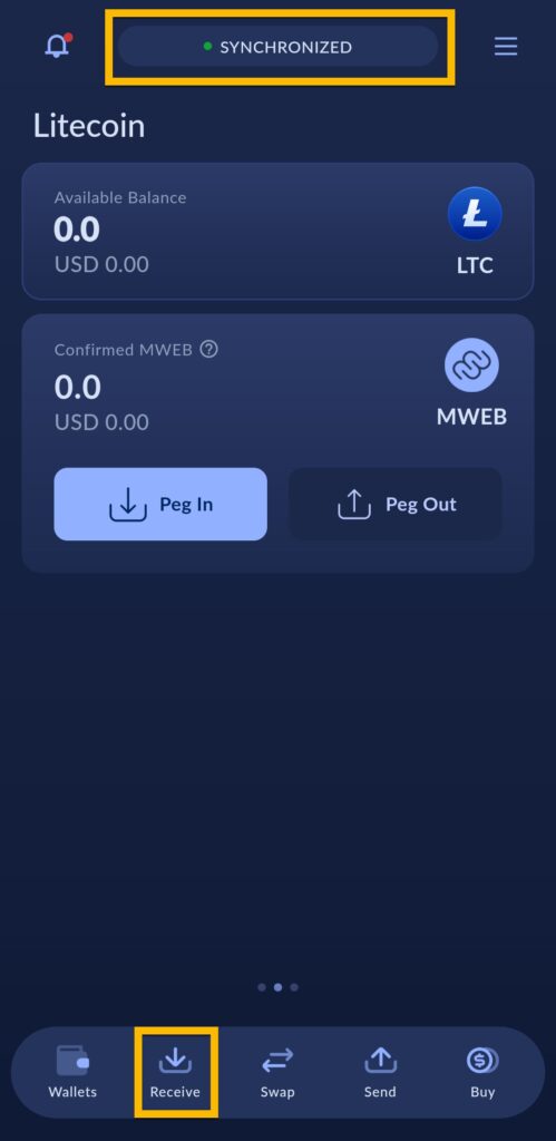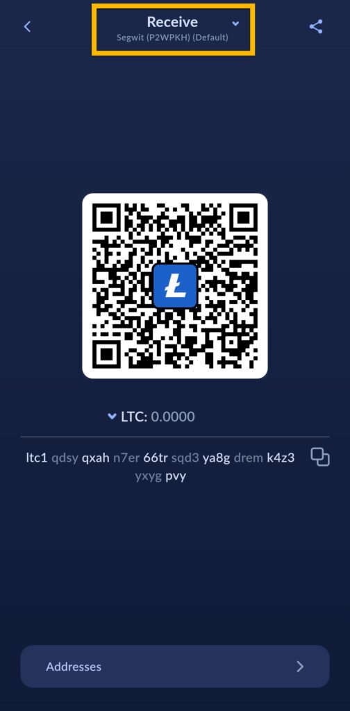 Du må da trykke på Receive for å generere en Litecoin on-chain adresse.