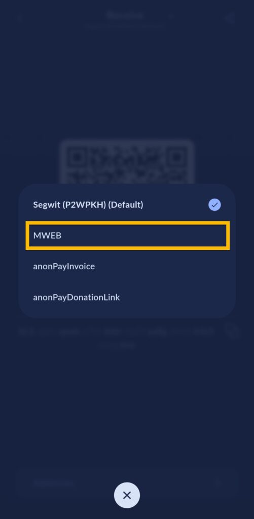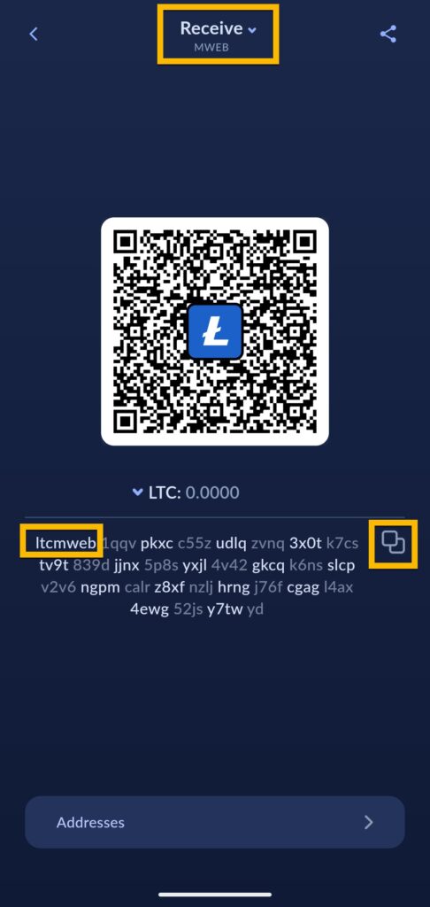 Ved å trykke på denne kan du veksle mellom on-chain og MWEB adressene.