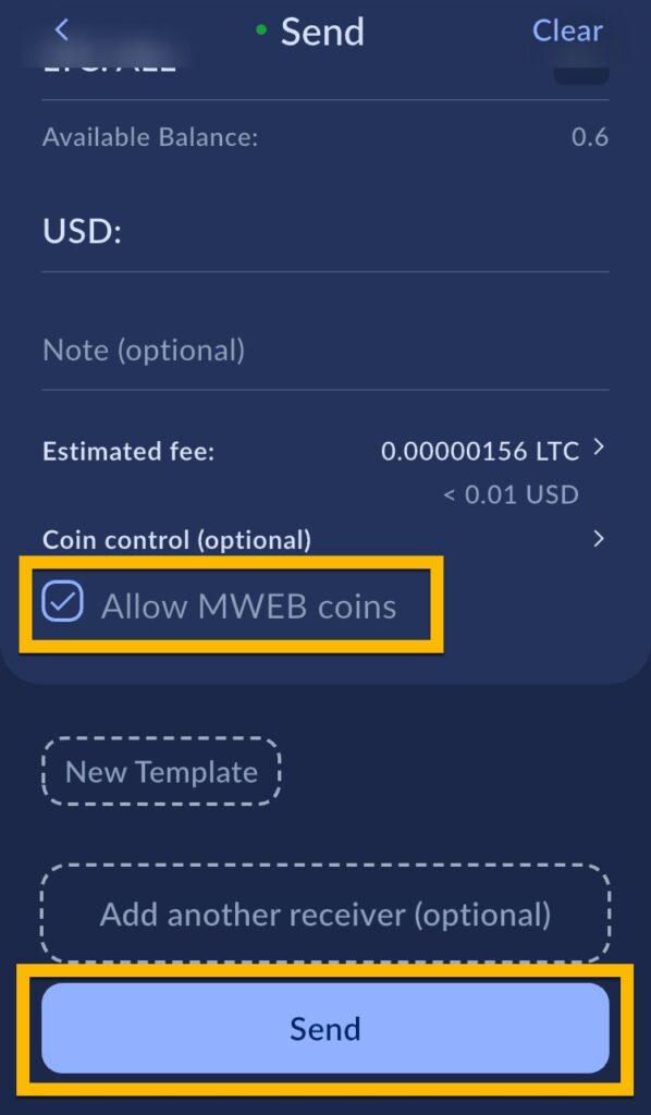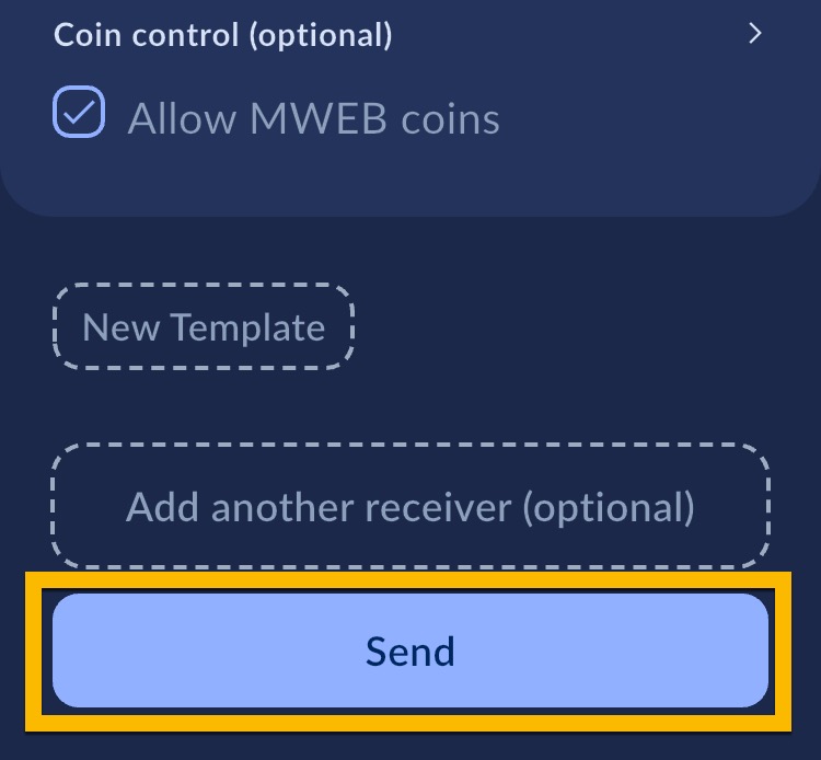 Kryss av for Allow MWEB coins, og trykk Send.