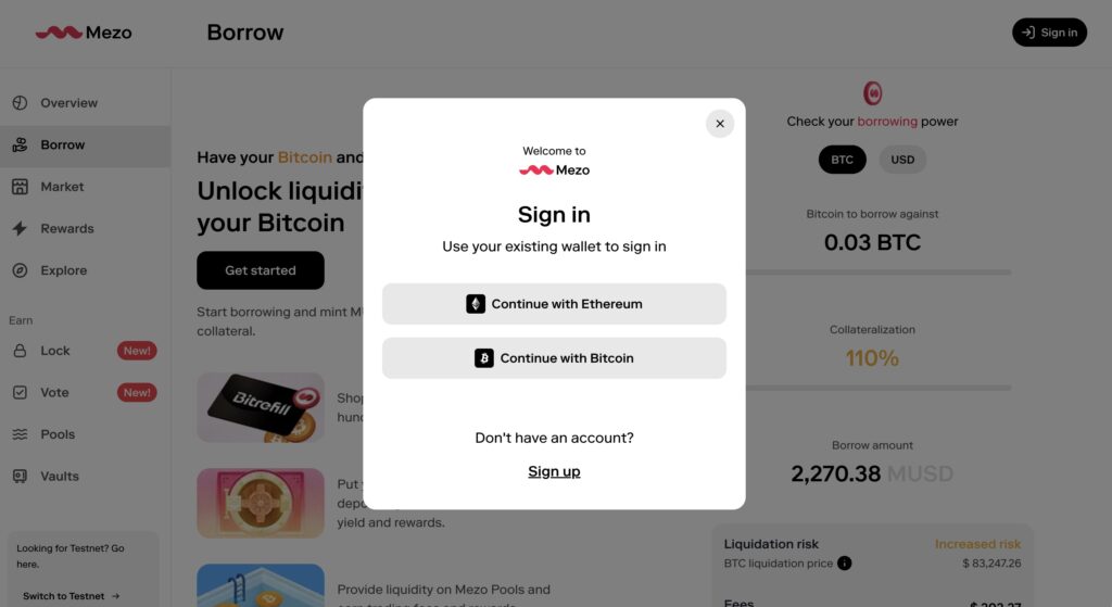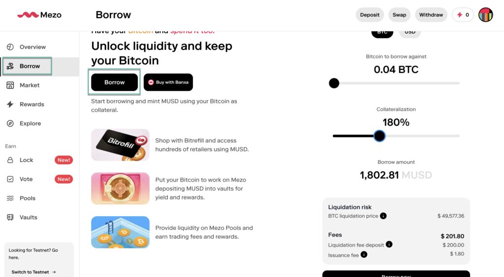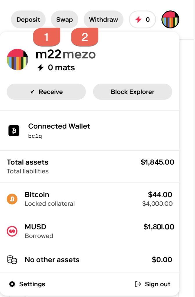 Vi skal nå steg for steg se på hvordan du kan skape dine egne MUSD med Bitcoin som sikkerhet, og deretter ta disse pengene ut fra Mezo, og bruke til hva du måtte ønske, være seg ferietur, oppgradering av boligen, eller kanskje til og med kjøpe mer Bitcoin. Sistnevnte omtales som gearing, og er svært utbredt i Finansverden (de gearer da ofte med aksjer i stedet).