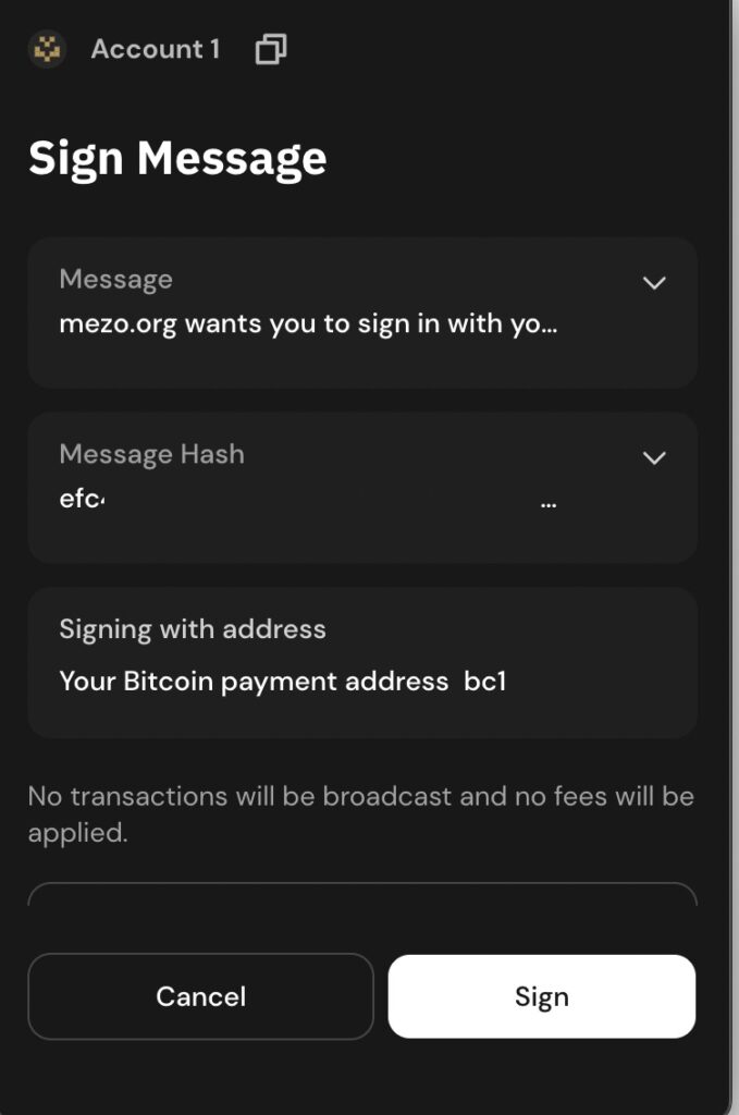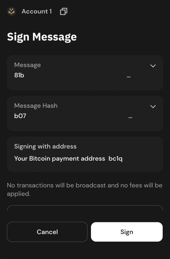 Klikk Sign for å bekrefte at du er eieren av Bitcoinkontoen.