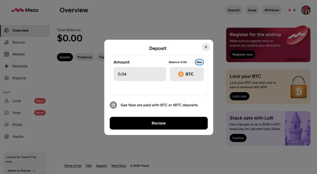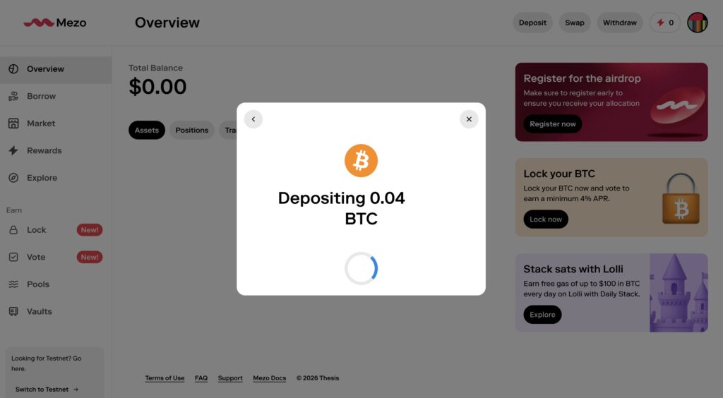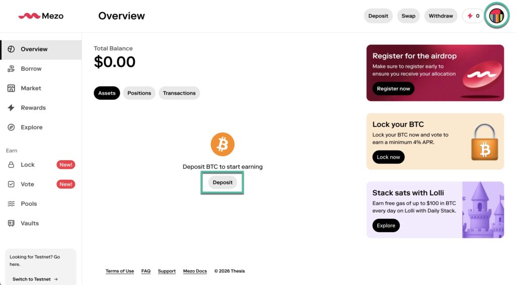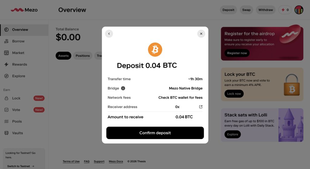 Klikk Deposit for å sette inn ønsket mengde Bitcoin inn i Mezo-plattformen fra Xverse walleten din.