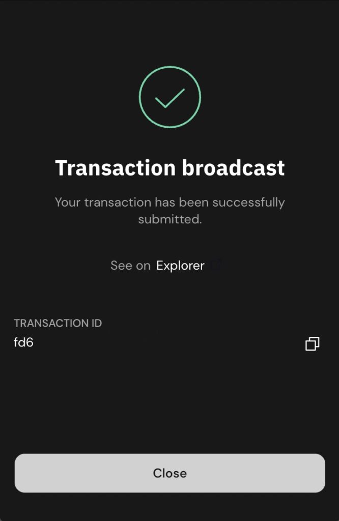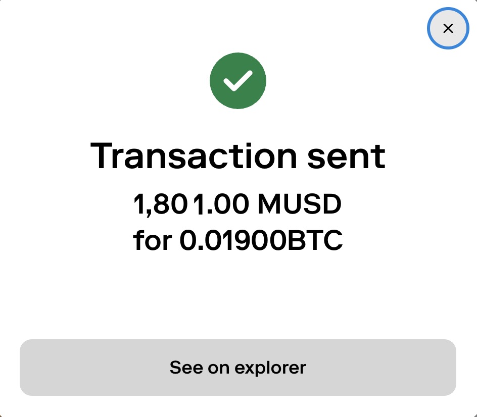 Da er transaksjonen iverksatt, og Bitcoinene du har vekslet om til, vil snart vært synlig i Bitcoin-walleten internt i Mezo.