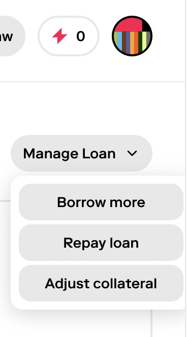 Øverst oppe til høye har du en knapp – Manage Loan – hvor du kan stille tilleggssikkerhet, hvis Bitcoin mot formodning skulle falle så mye. Under denne knappen har du også mulighet til å innfri lånet når du selv måtte ønske.