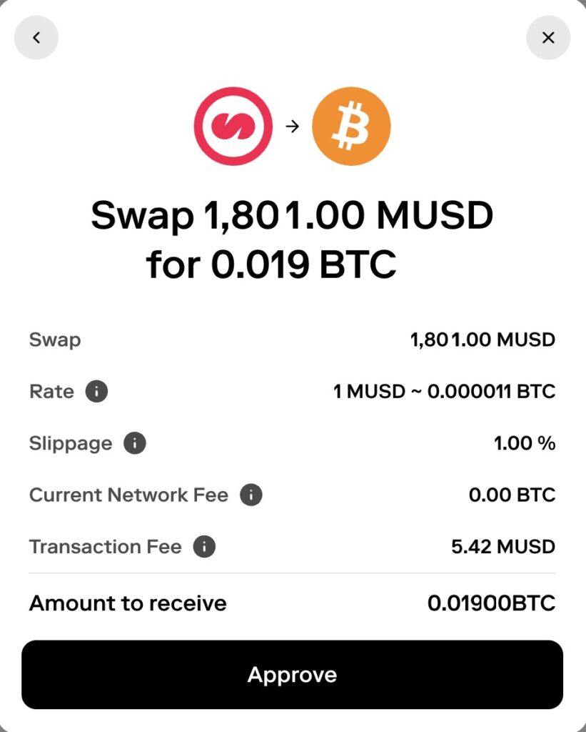 Du vil da motta MUSD. - 5. Deretter til du swappe disse MUSD til en annen kryptovaluta som er mer i bruk, være seg Bitcoin, Ethereum, PAXG (gull), eller kanskje de mer kjente stablecoinene USDT/USDC.